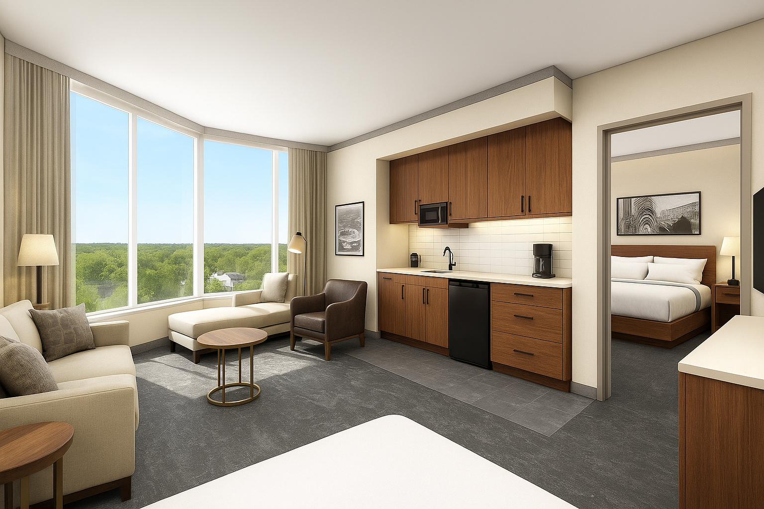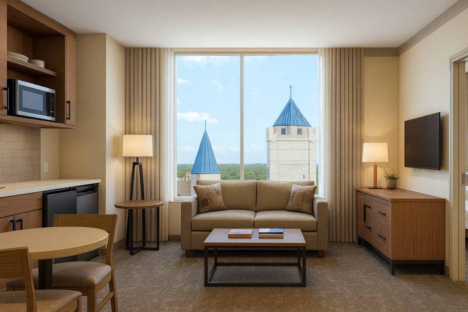 Every room at Highpoint Hotel is intentionally designed to provide a quiet and restorative atmosphere for guests experiencing life’s most meaningful moments. Featuring natural textures, soft lighting, and panoramic views of Sioux Falls, our 56 guest rooms and suites combine modern comfort with a calming ambiance. Each room includes ADA-accessible layouts, plush bedding, and intuitive amenities, ensuring that every stay is effortless and enjoyable. Whether you are here for just one night or an extended visit, our rooms offer a space to rest, reflect, and recharge, away from the noise and close to what truly matters.